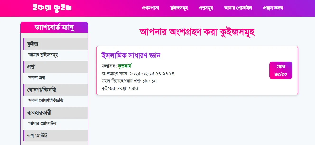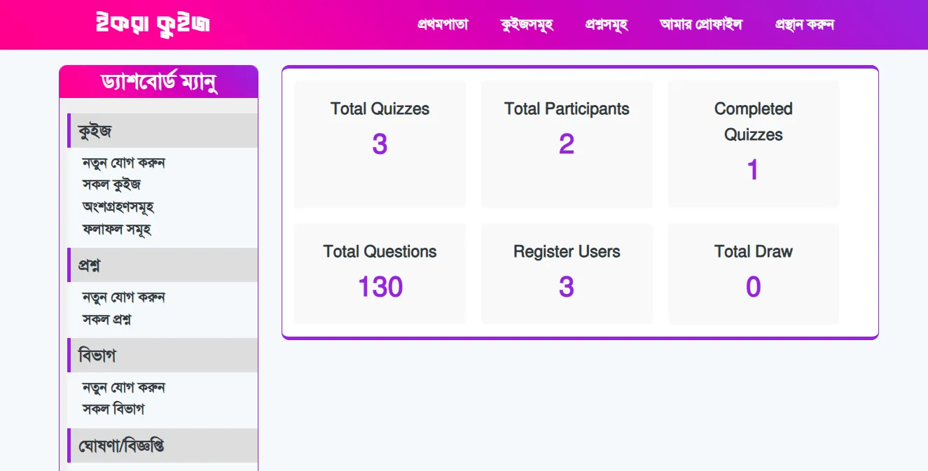 The Quiz Contest Website is an interactive platform designed to test and enhance users' knowledge. It allows participants to take quizzes, track their scores, and even enter automated raffle draws based on their participation. The platform supports random question quizzes and admin-selected quizzes, ensuring an engaging and dynamic experience.